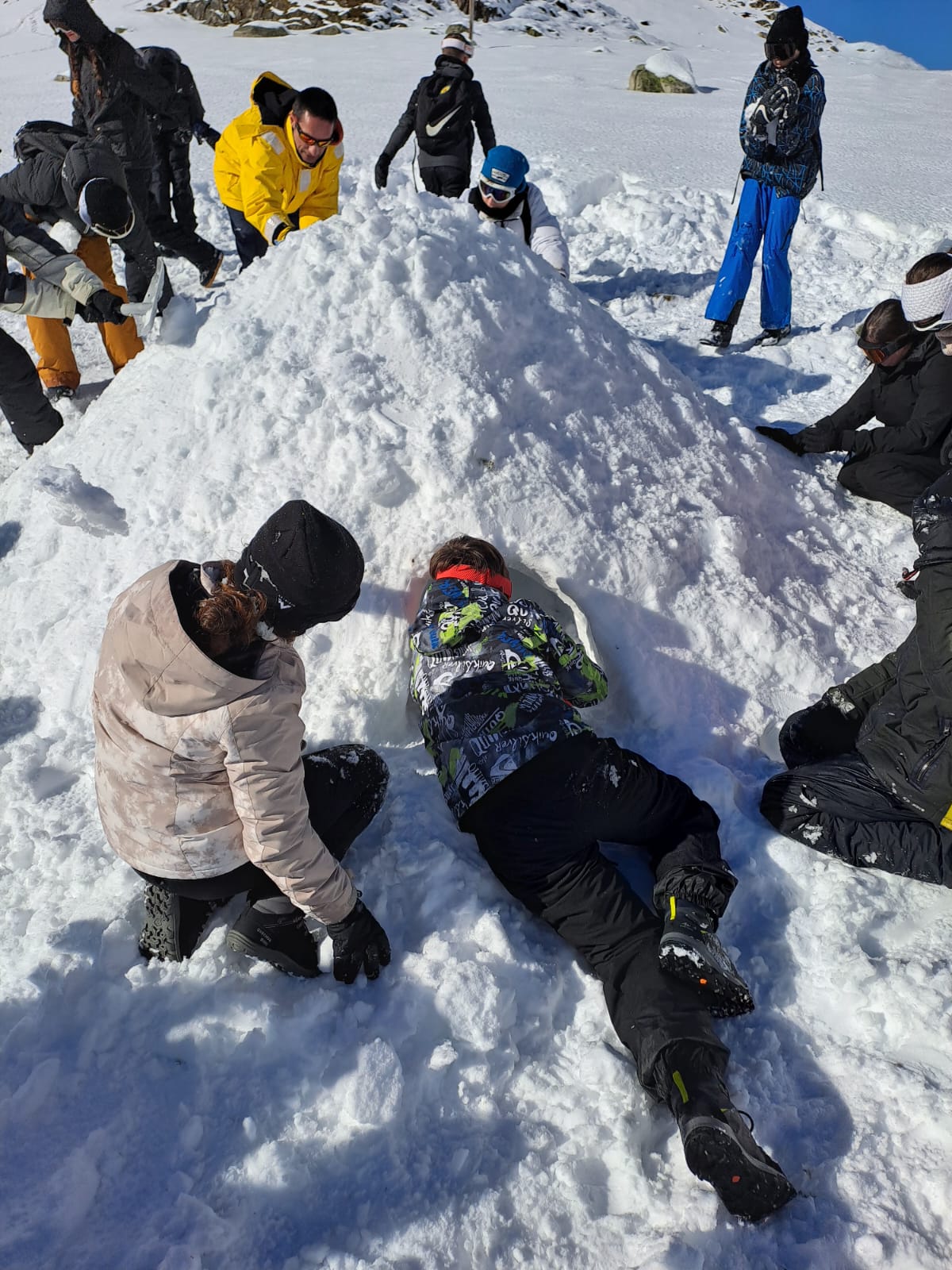 Sans faire exprès, un élève a envoyé une boule de neige dans la tête du guide (Sylvain) qui a alors arrêté l’activité de construction d’igloo. Désolé !!