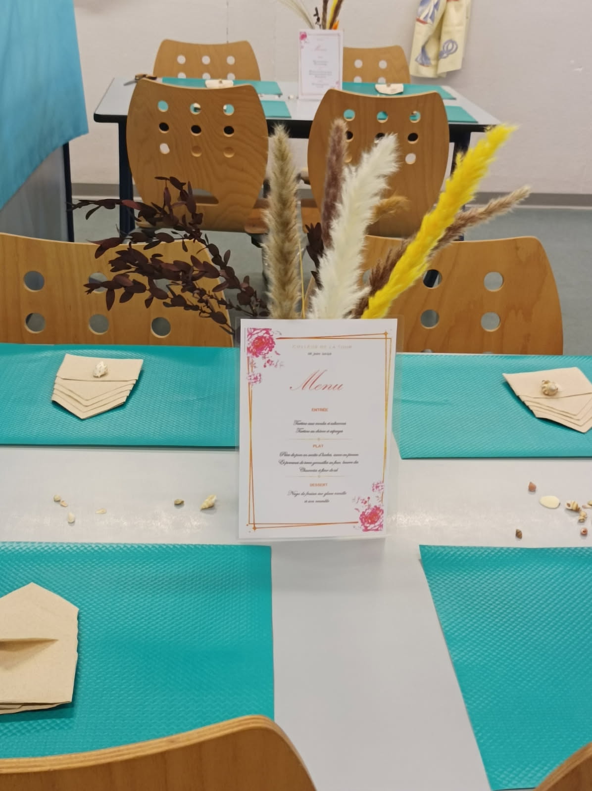 Jeudi 5 juin, les élèves ont pu se restaurer en musique dans un réfectoire décoré pour l’occasion. Ils ont été servis à table et ont pu déguster un repas gastronomique, intégrant des produits de saison issus de circuits courts. Au menu, une entrée autour des saveurs marines et végétales — tartine de moules et salicornes ou alternative au chèvre et asperges — suivie d’un plat principal composé d’une pièce de porc en croûte d’herbes accompagnée d’une sauce au pineau, de pommes de terre rôties au beurre des Charentes et fleur de sel. Le dessert proposait une nage de fraises sur glace surmontée de crumble.
